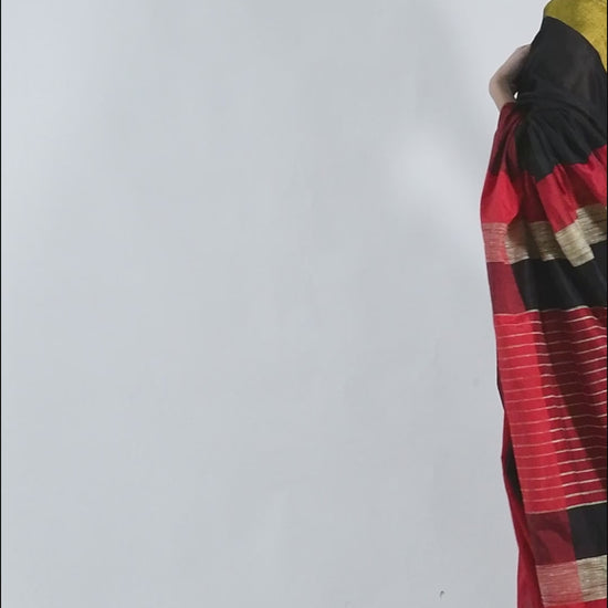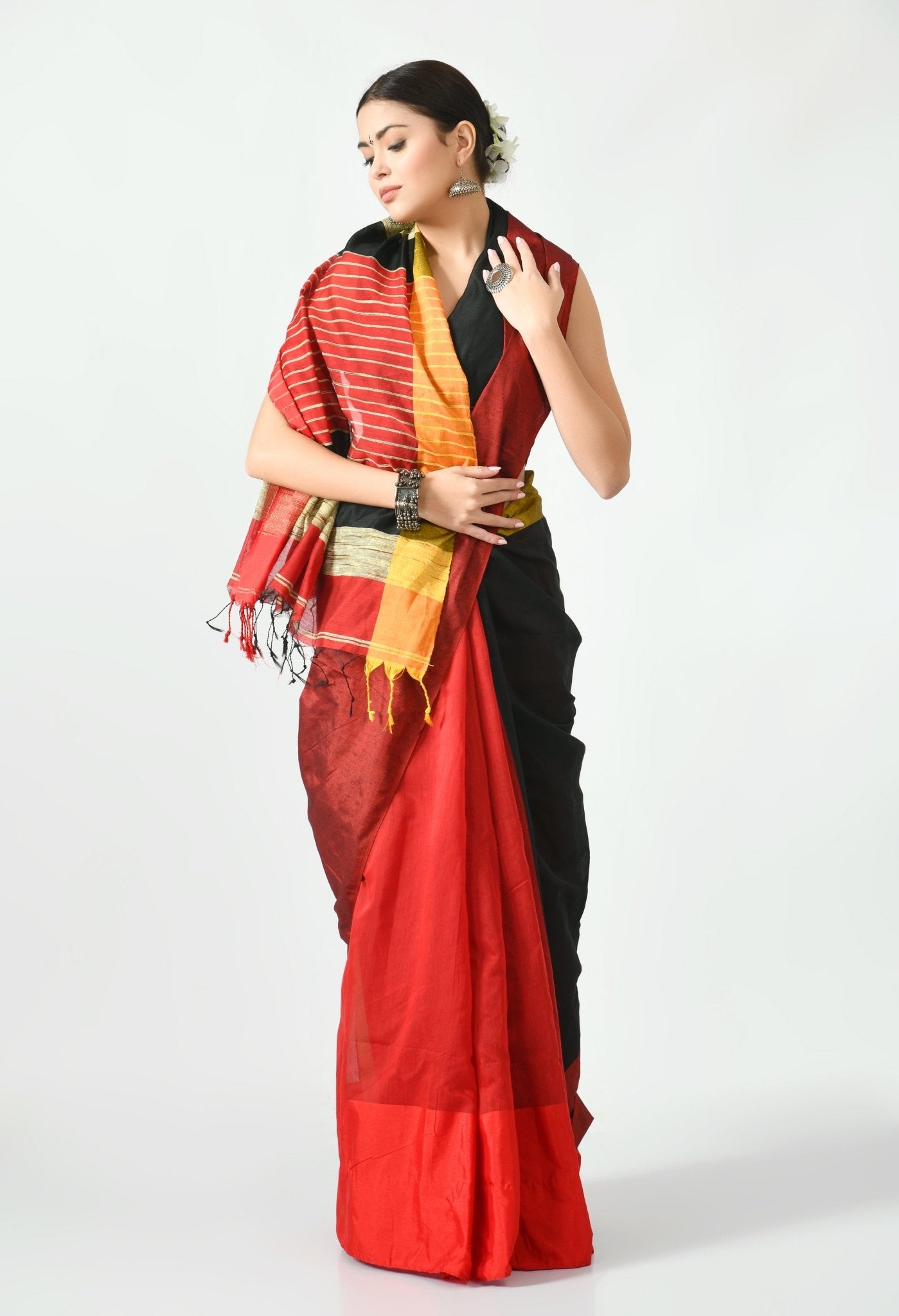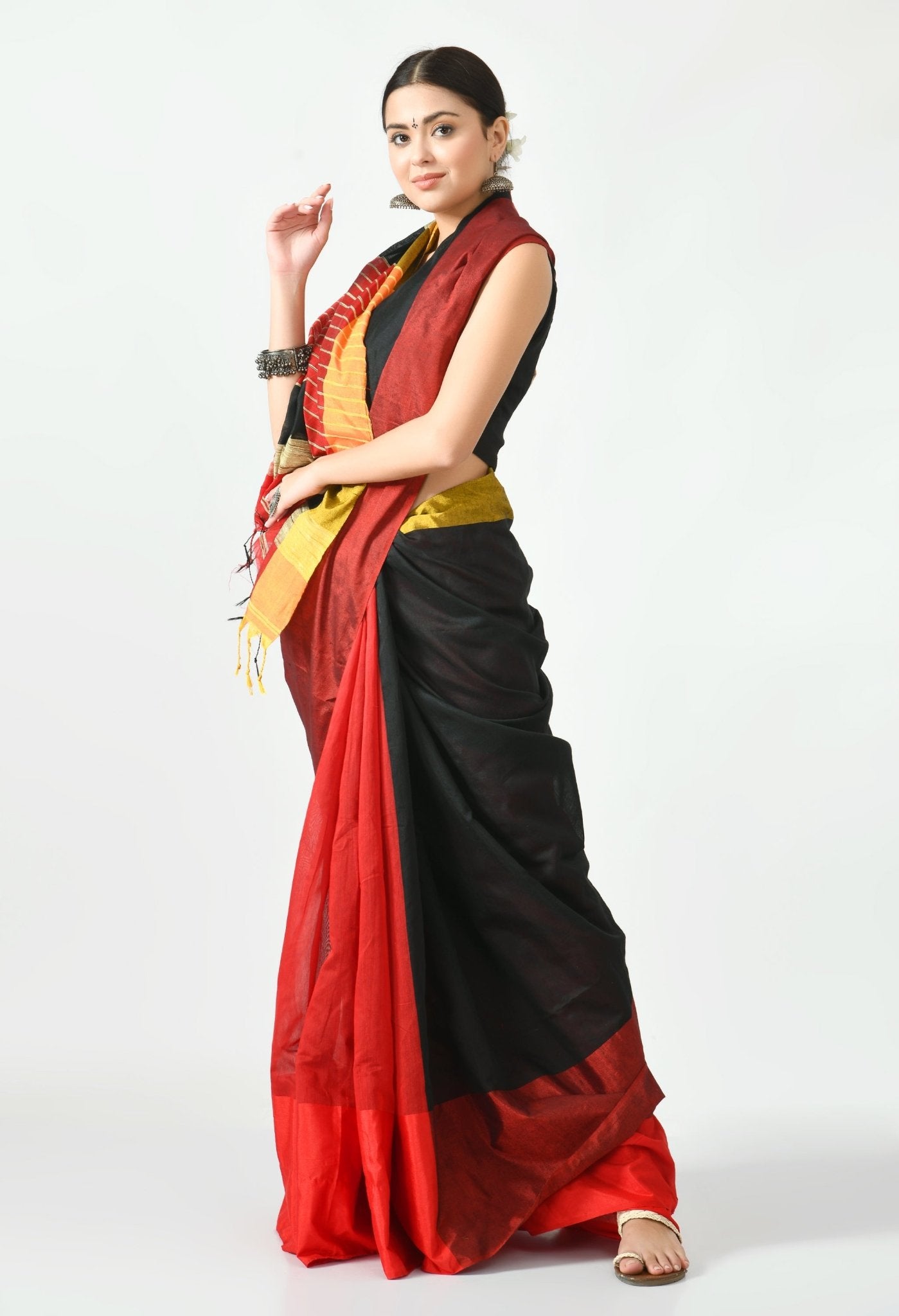 Description: Swapna Creation Cotton Silk saree with broad border and woven pallu. Due to the distinct broad border only these sarees are otherwise called as mahapaar in bengali. The saree has running blouse piece. The half n half design of saree gives it a very beautiful look.